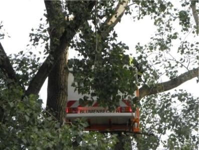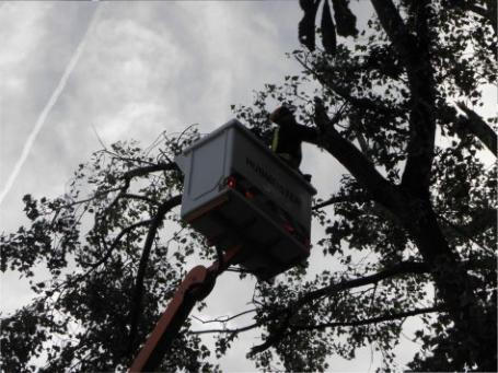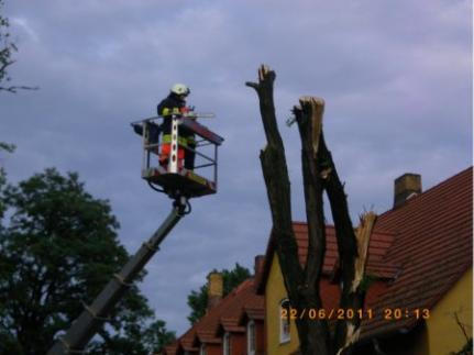 22.06.2011Gegen 17:15 Uhr zog ein Unwetter über Bad Lauchstädt hinweg und richtete erhebliche Sturmschäden hauptsächlich an Bäumen und einzelnen Gebäude-dächern an. Schnell und unkomliziert half die Firma Blumenbecker aus Schaf-städt mit einem Hubsteiger-Fahrzeug aus, um ab- oder angebrochene Äste aus Baumkronen beseitigen zu können.
