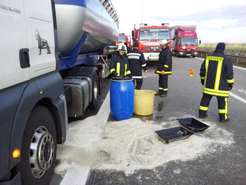 10.12.2011Am 10.12.2011 wurden wir um 9:58 Uhr zur Autobahn 38 gerufen. Hier war einem LKW während der Fahrt etwas an den linken Tank geflogen und hatte in den Behälter an einer tiefen Stelle ein Loch geschlagen. Der Tank wurde durch die Feuerwehr geleert.