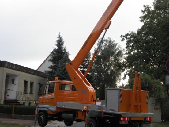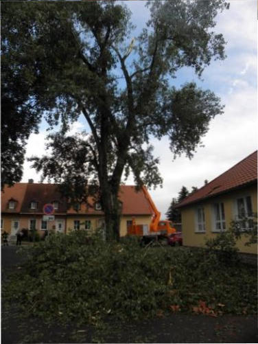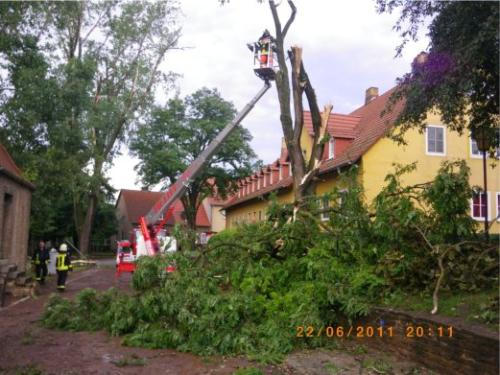 22.06.2011Gegen 17:15 Uhr zog ein Unwetter über Bad Lauchstädt hinweg und richtete erhebliche Sturmschäden hauptsächlich an Bäumen und einzelnen Gebäude-dächern an. Schnell und unkomliziert half die Firma Blumenbecker aus Schaf-städt mit einem Hubsteiger-Fahrzeug aus, um ab- oder angebrochene Äste aus Baumkronen beseitigen zu können.