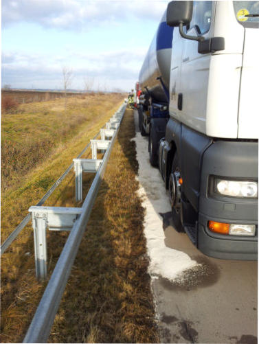 10.12.2011Am 10.12.2011 wurden wir um 9:58 Uhr zur Autobahn 38 gerufen. Hier war einem LKW während der Fahrt etwas an den linken Tank geflogen und hatte in den Behälter an einer tiefen Stelle ein Loch geschlagen. Der Tank wurde durch die Feuerwehr geleert.